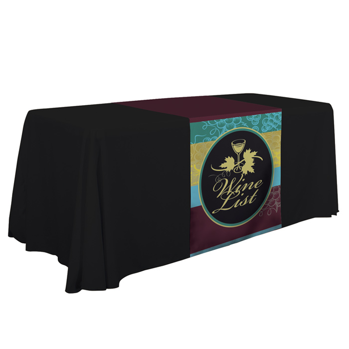 - These 28 inch wide table runners can be draped over any table throw so you can add your logo or design with style.