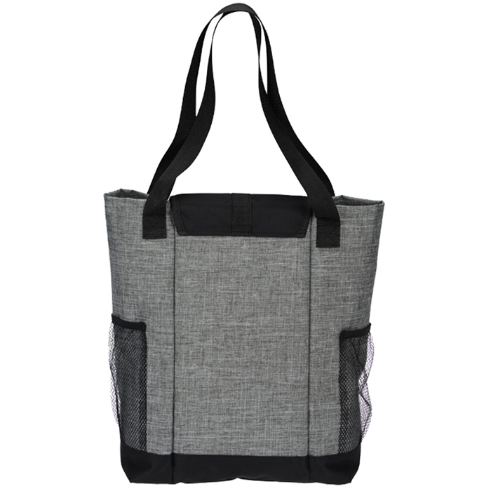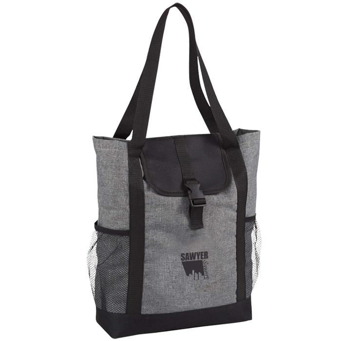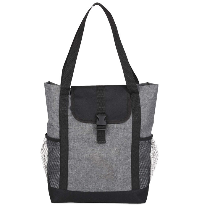 • This grey tote with black trims has a main compartment is secured by an easy to fasten buckle and flap closure, as well as 2 black mesh pockets to the front for additional storage.