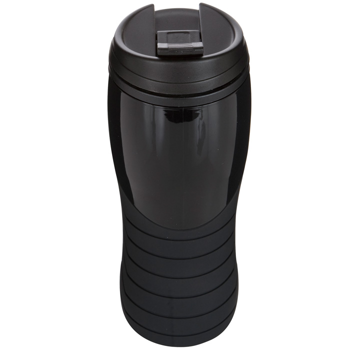- A double-walled, 400ml travel mug with a textured rubberised base and a glossy top section.