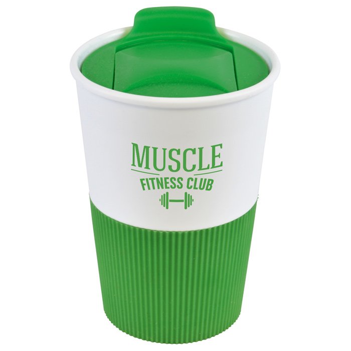 • White, 350ml single-walled take-away style thermal mug with a coloured textured grip and matching coloured lid.