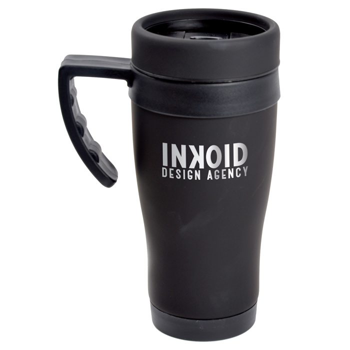 • 450ml stainless steel travel mug featuring a painted matt-black finish with a plastic handle and inner.