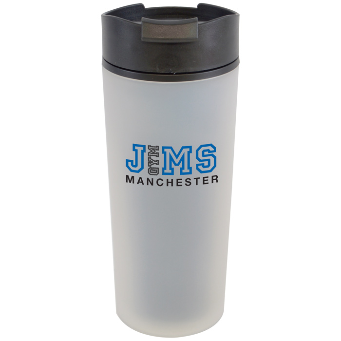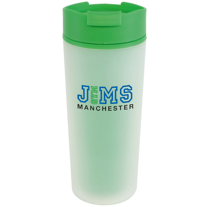• 500ml double-walled travel mug each with a flip-up drinking spout, solid coloured inner and matching coloured anti-spill screw top lid.