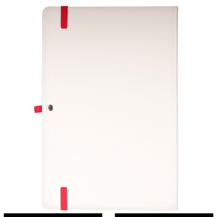- White notebook with a soft cover that'll be printed with your barnding message.