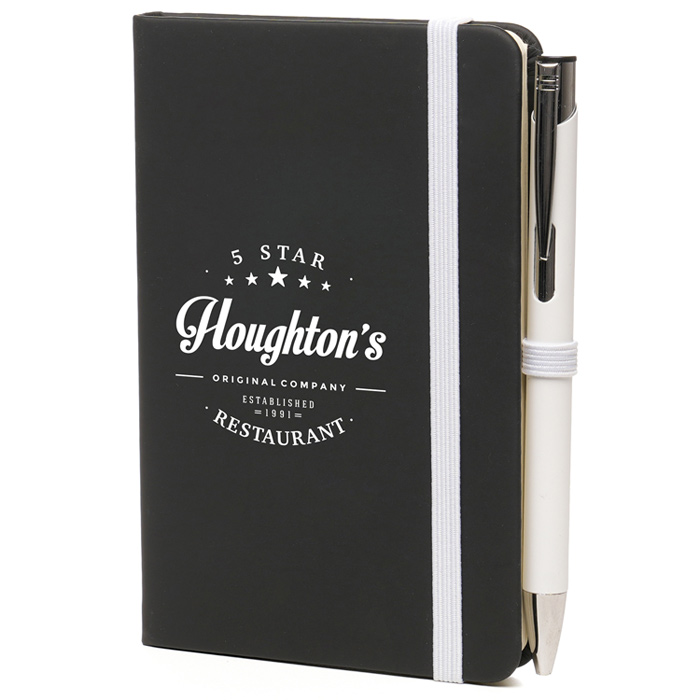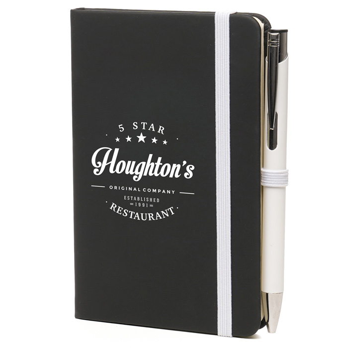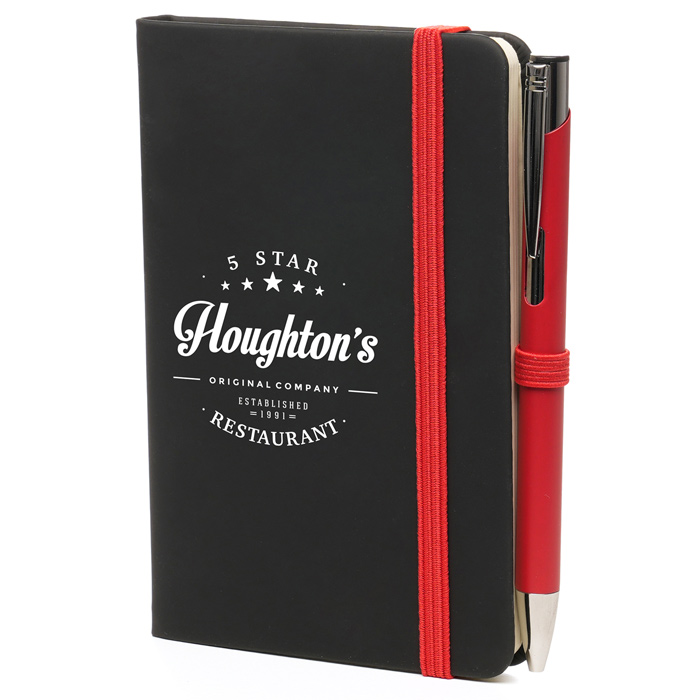 - Personalisation area: 50 x 120mm (notebook, front cover) 50 x 10mm (pen, in-line with the clip; engraved)