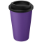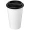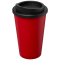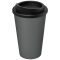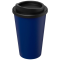 - Double-walled thermal mug in a choice of solid colours, each with a black screw top lid, both mug and lid are made from 100% recycled plastic.